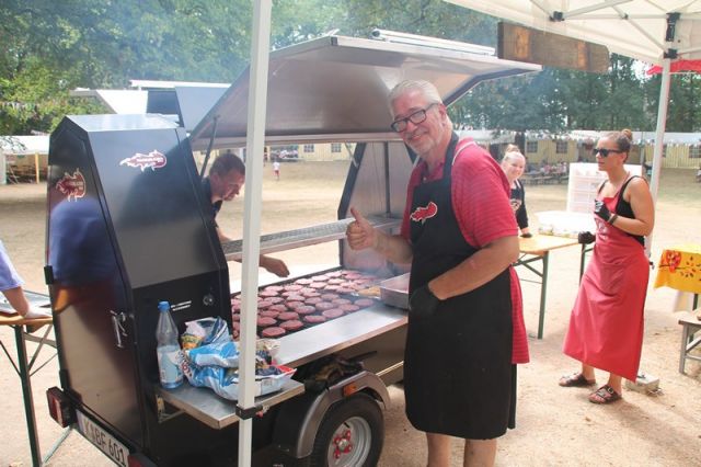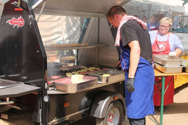 Eine echte Premiere in der HöVi-Land-Küche bereitete uns John van Nes-Ziegler mit seinem Grillanhänger. In Kooperation mit dem Burger Restaurant „Die fette Kuh“ bereitete er für alle HöVi-Land-Kinder frisch gegrillte Cheeseburger frisch auf dem Platz zu. Unterstützt wurde er dabei von unserem eingespielten Küchenteam. „Die schmecken ja ganz anders als bei der Burgerkette“, wunderte sich so manches Kind, „einfach genial!“.