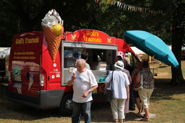 Wolfgang „Wolli“ Krämer hat ein besonders großes Herz und macht ein traumhaftes Eis. Bereits zum achten Mal besuchte er mit seinem Eiswagen das HöVi-Land und verschenkte an alle Kinder Eis bis zum Abwinken. Schnell bildete sich eine lange Schlange vor dem Eiswagen und die Auswahl aus den neun Sorten viel so manchem Kind schwer: „Vanille und Schokolade; nein, doch Grüner Apfel und Zitrone; nein, nein, ich nehme doch lieber Himbeere und Erdbeere!“ Zum Abschluss auf der Bühne versprach Wolli dann auf jeden Fall im nächsten Jahr wieder zu kommen und überhaupt jedes Jahr, denn er sei ja mittlerweile ein richtiger HöVi-Länder geworden. Darauf gab es natürlich einen tosenden Beifall von allen kleinen und großen Eisfans. Wer auch sonst Wolli´s Traumeis genießen möchte, muss weit fahren, nämlich bis nach Reken im Kreis Borken. Von dort fährt er mit seinem Eisauto in alle Welt – und eines sei noch verraten: Den Titel „Traumeis“ hat sich das Eis von Wolli absolut verdient.