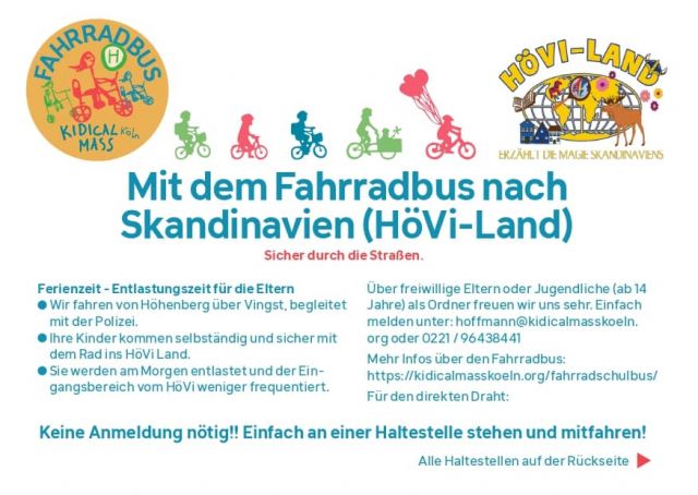Dafür hat der Verein Kidical Mass einen Fahrradbus ins Leben gerufen. Mit Musik, Spaß und Gemeinschaft sorgen wir dafür, dass die Kinder sicher zum HöVi-Land kommen. So können die Eltern einen entspannten Morgen genießen und müssen ihre Kinder nicht gestresst zum HöVi-Land bringen.